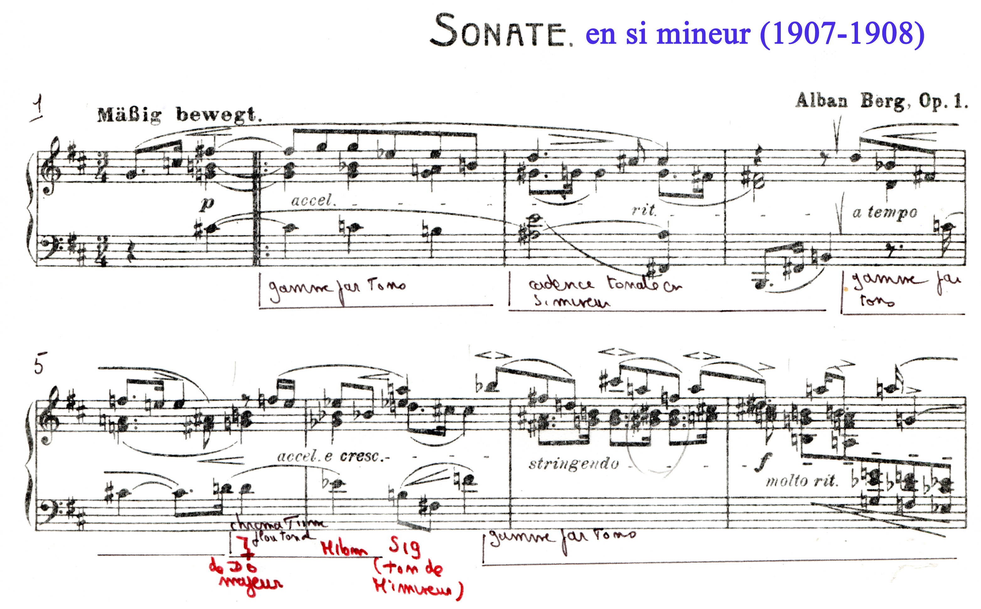 Voici un exemple avec la sonate pour piano en Si mineur d’Alban Berg (1907-1908) qui fait se côtoyer des cadences tonales, des gammes par tons, et du chromatisme.