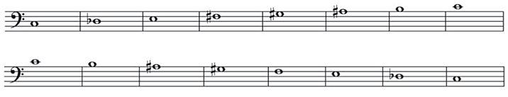 Pour finir, on remarquera une petite subtilité. Lorsque la gamme descend, dans la version partant de Do, le Fa# se transforme en Fa bécarre, créant une deuxième seconde augmentée (Fa Sol#).