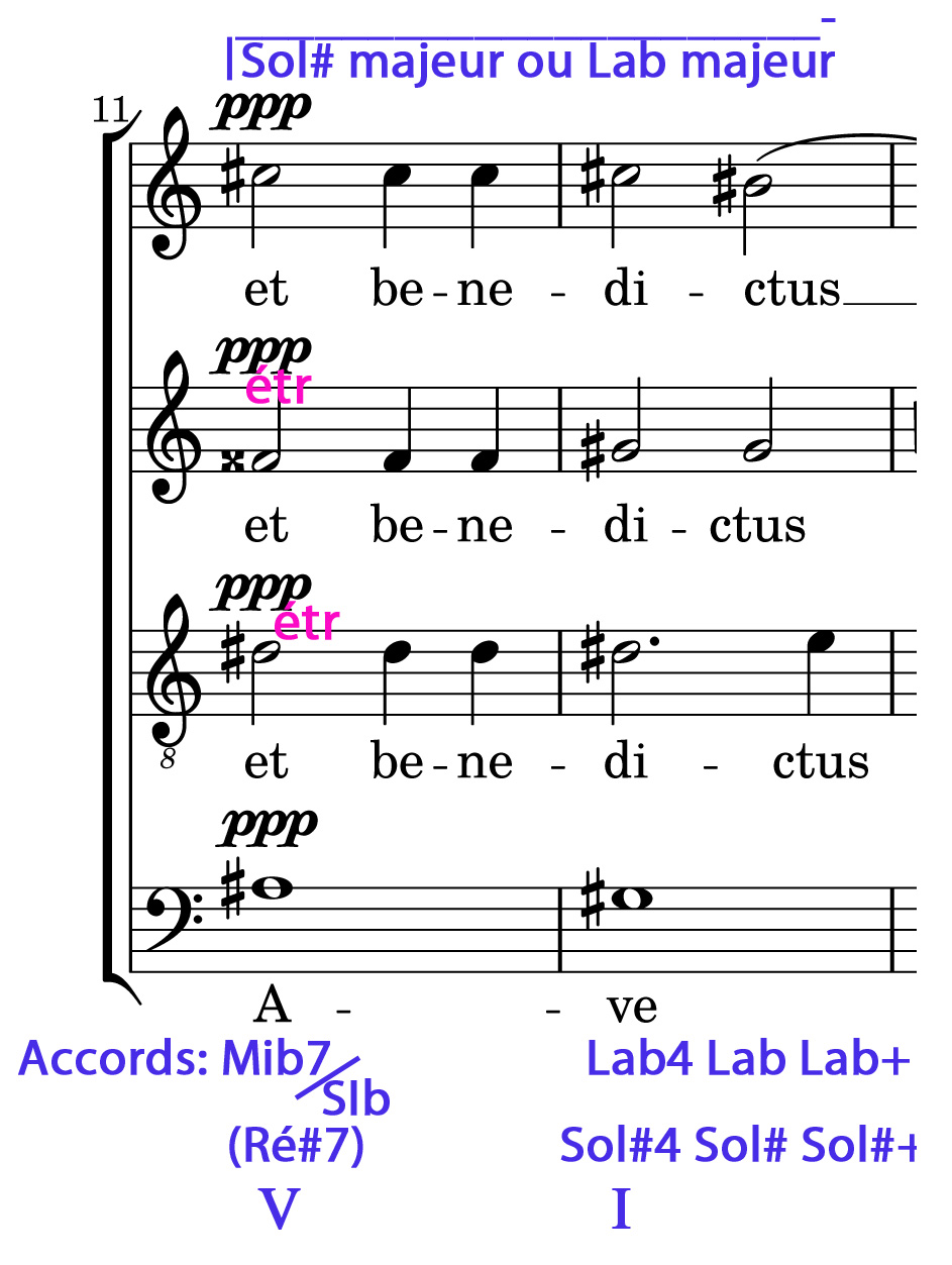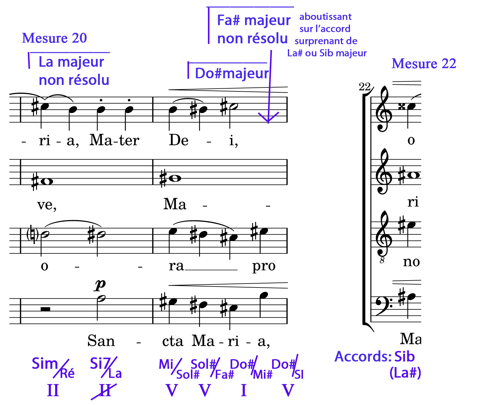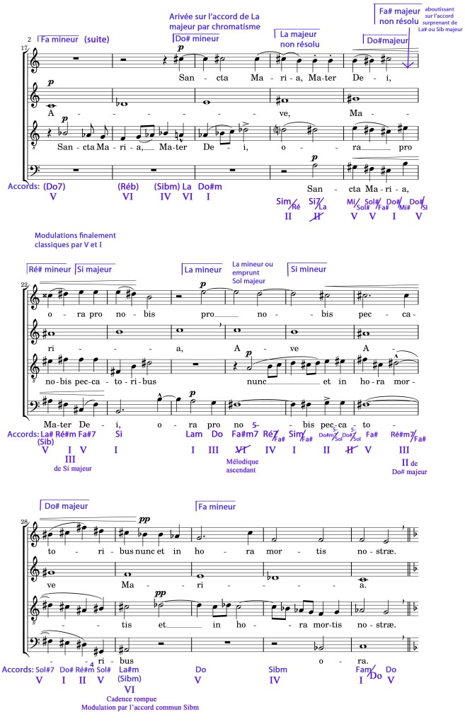 Après les cadences tonales et le flou créé par le chromatisme, nous avons dans cet Ave Maria plusieurs exemples de modulations ambigües car ne se résolvant pas sur une tonique.