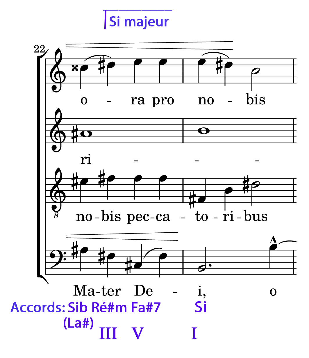 De même les mesures 22 et 23 présentent une cadence parfaite en Si majeur avec les 2 accords V (Fa#7) et I (Si majeur).