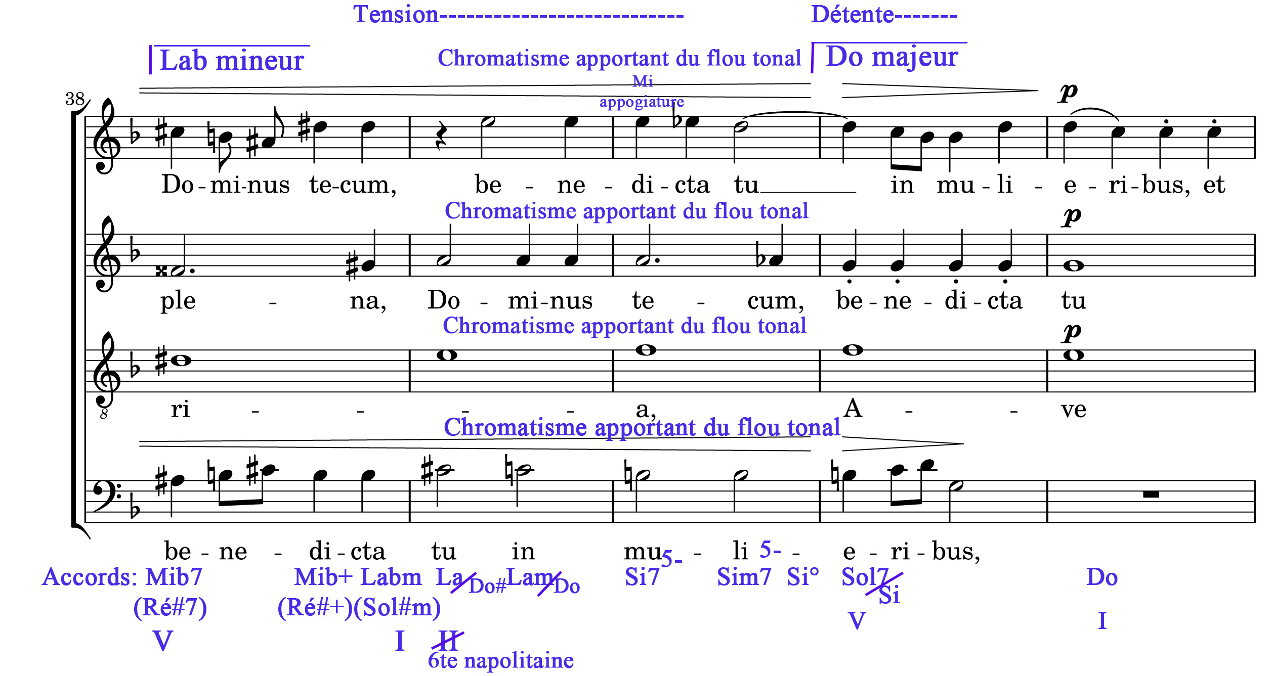 Annie : Evidemment. Ecoutez les mesures 38 à 42, c’est le point culminant de la pièce. Dans les mesures 38 à 40, toutes les voix montent vers l’aigu chromatiquement pour soutenir la poignante ascension des sopranos sur les mots « Marie, le Seigneur est avec vous, vous êtes bénie entre toutes les femmes ». S’ensuit une détente avec la cadence en Do majeur V (Sol7) et I (Do majeur).