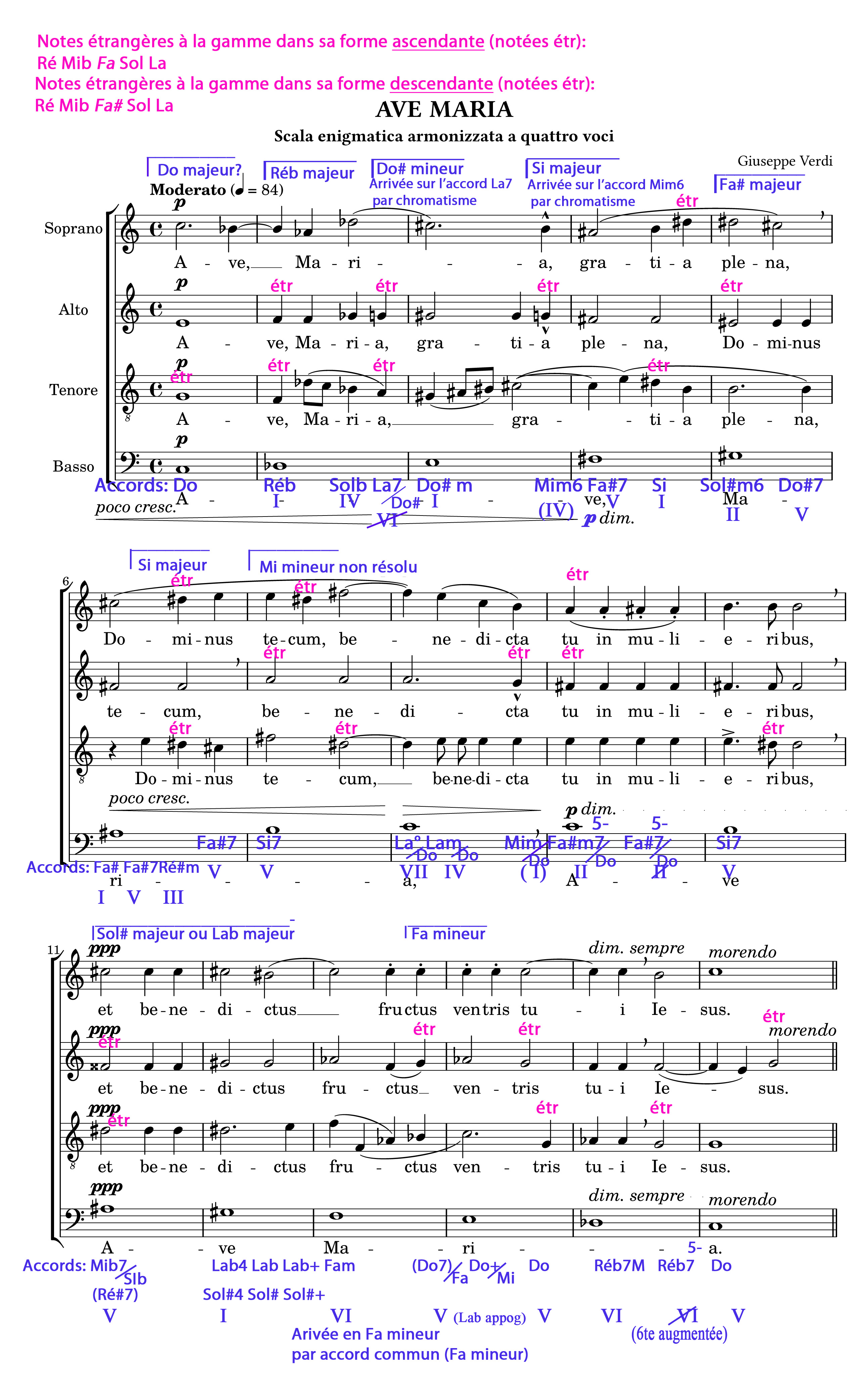 Après l’avoir fait entendre aux basses et aux alti dans les mesures 1 à 32, il la transpose une quarte au-dessus, ce qui permet aux ténors et aux soprani de l’exécuter sans difficulté. Verdi ajoute alors « J’ai fait deux Ave Maria. »