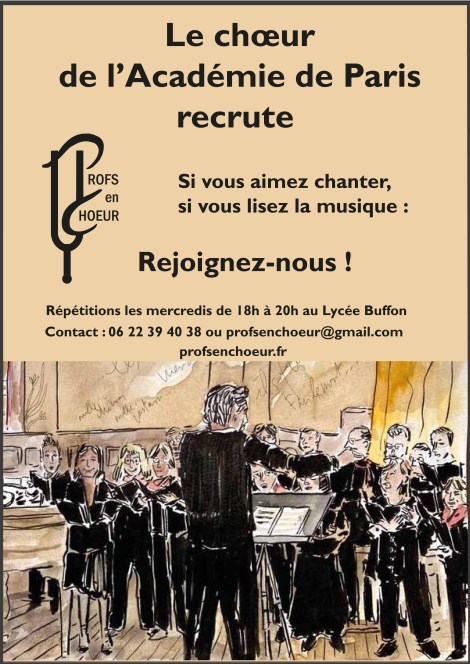 Vous habitez à Paris, vous êtes enseignant (toute académie), vous savez déchiffrer à vue ou vous avez une bonne oreille, vous avez des connaissances de base de technique vocale…